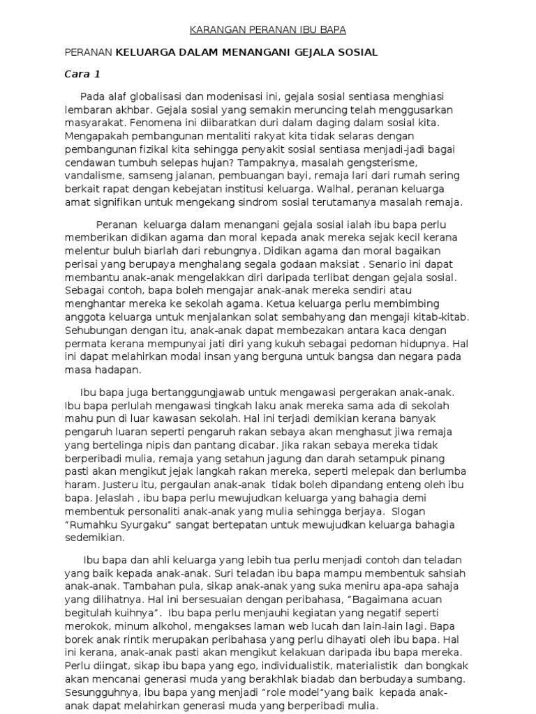 Oleh sebab itu rugi jikalau pelajar tidak mendapat markah yang cemerlang dalam. Sejak kempen antidera diperluas ibu bapa mula menjauhkan diri mereka dengan rotan. KARANGAN PERANAN IBU BAPA PERANAN KELUARGA DALAM MENANGANI GEJALA SOSIAL Cara 1 Pada alaf globalisasi dan modenisasi ini gejala sosial sentiasa menghiasi lembaran akhbar.
